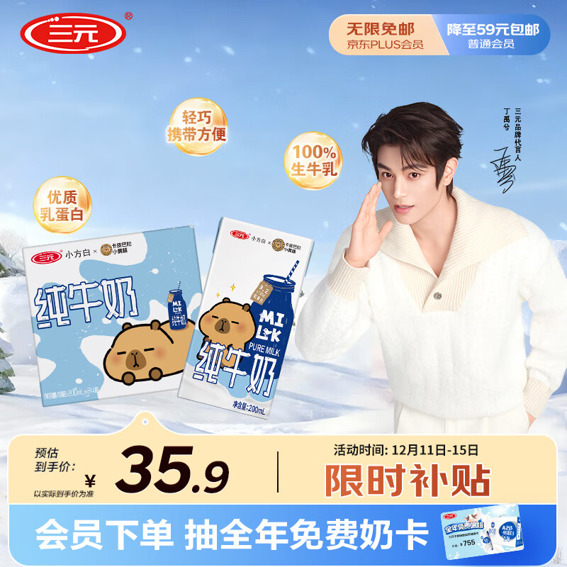 包邮 三元小方白纯牛奶200ml*24盒 100%生牛乳